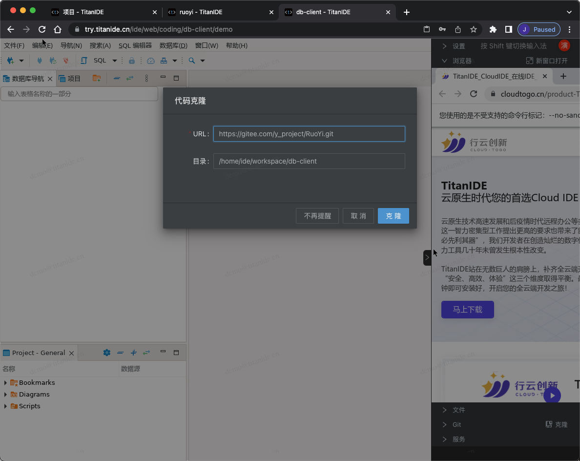 方式一:如果您的SQL脚本已经在代码仓库,那么您可以通过 Git 直接克隆到 DBeaver 的工作区,这里我导入的是 RuoYi数据库,因此克隆RuoYi项目,在随后恢复数据库的时候选择工作区的SQL脚本文件