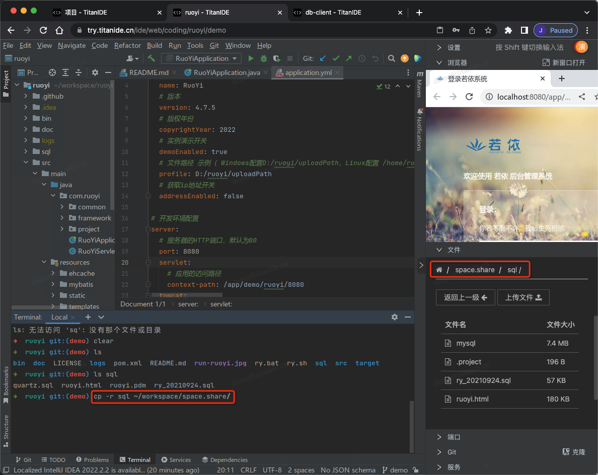 方式三:如果您是在 TitanIDE 上已经克隆了代码到同一个开发空间的其它项目,则可以通过一个 space.share 的文件来共享SQL脚本,在随后恢复数据库的时候选择 space.share 的SQL脚本文件: