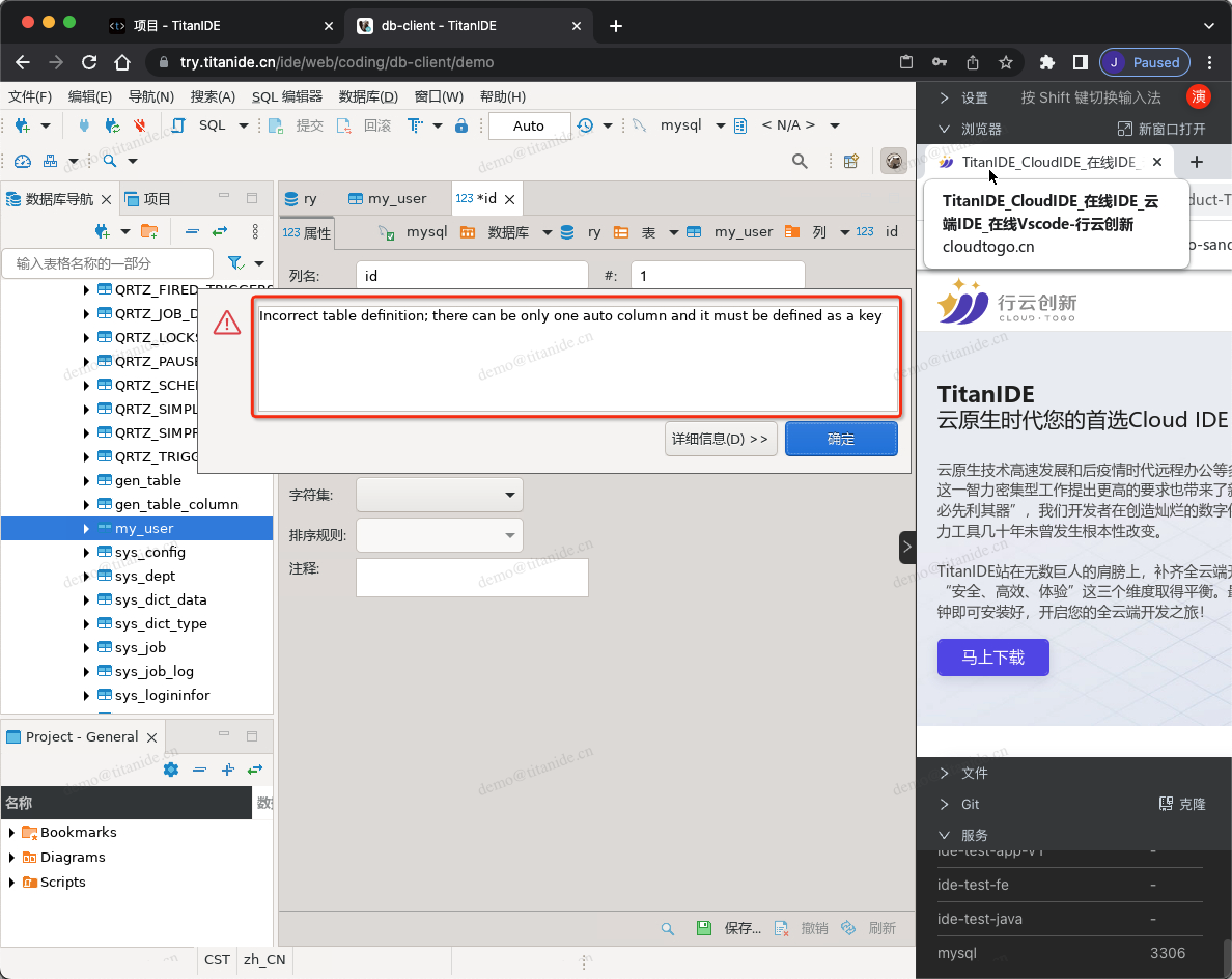 特别注意:在创建表的字段设置自增时报错「incorrect table definition there can be only one auto column and it must be defined as a key」,该怎么解决呢?