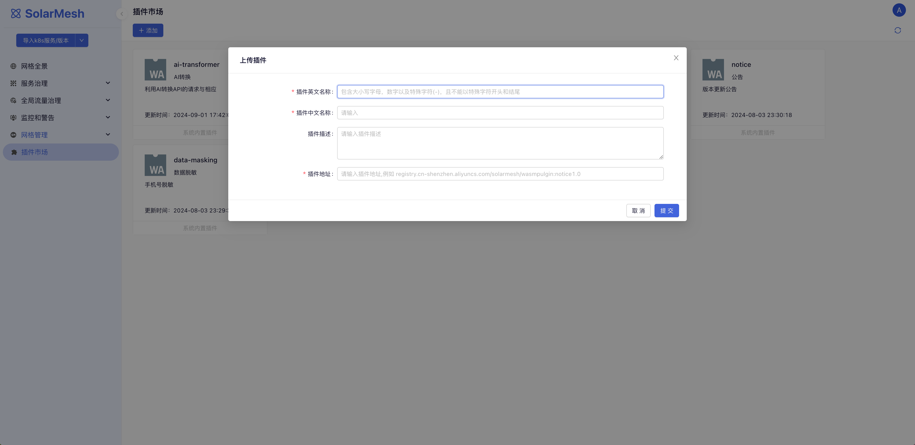 如果你们自己也开发了wasm插件,那么也可以通过点击添加插件将插件上传到SolarMesh中。