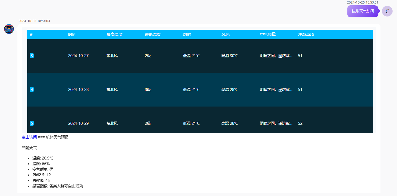 在“天气查询”智能体应用,即可使用天气查询来获得卡片信息。